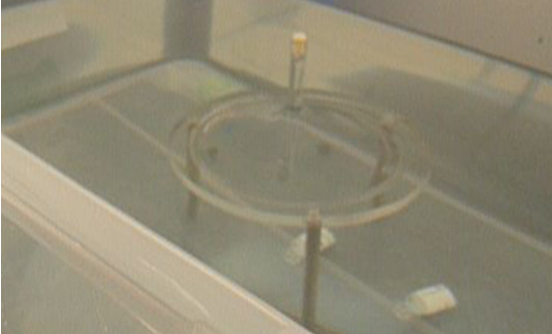3、將氣體采裝置放入水箱中,完全去除裝置表面氣味,尤其是漏斗集氣管內(nèi)部的微小氣泡,以防止水中殘留氣體影響測試精度。將采集罩頂端用橡膠塞塞住并浸入水中,使細柱端向下,用金屬棒伸入采集罩的細柱內(nèi)輕輕攪動,使細柱內(nèi)部的空氣溢出;然后將其翻轉(zhuǎn)放置在支架上。