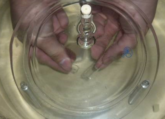 5、雙手持安瓿置于采集罩的正下方,稍用力將安瓿掰開,其內(nèi)部氣體逸出后進入正上方的采集罩的細柱內(nèi)。注意:操作前雙手應清洗干凈,避免將氣體帶入容器內(nèi)。確保氣體將細柱填滿,如不能,用金屬棒伸入細柱內(nèi)輕輕攪動,將氣泡導入細柱。
