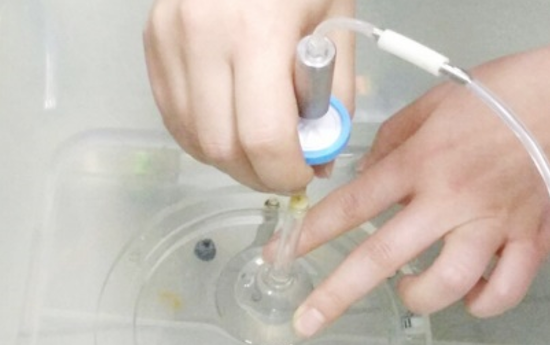6、在水中裝置下部輕輕開啟西林瓶瓶蓋,容器內(nèi)氣體被自動收集到漏斗頂部的集氣管中,如此便可以實現(xiàn)多個小規(guī)格包裝容器的頂空氣體的連續(xù)、精準收集。利用頂空氣體分析儀的取樣探針刺入集氣管的硅膠塞內(nèi),抽取試驗氣體進行分析,就能自動出具采集氣體中氧氣的含量。切記,用頂空氣體分析儀抽氣時不能抽取水。