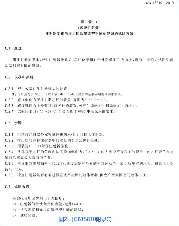 一次性無菌注射器器身密合性按照下圖2試驗(GB15810標(biāo)準(zhǔn)中的附錄C),活賽或密封圈處應(yīng)無液體泄漏現(xiàn)象;