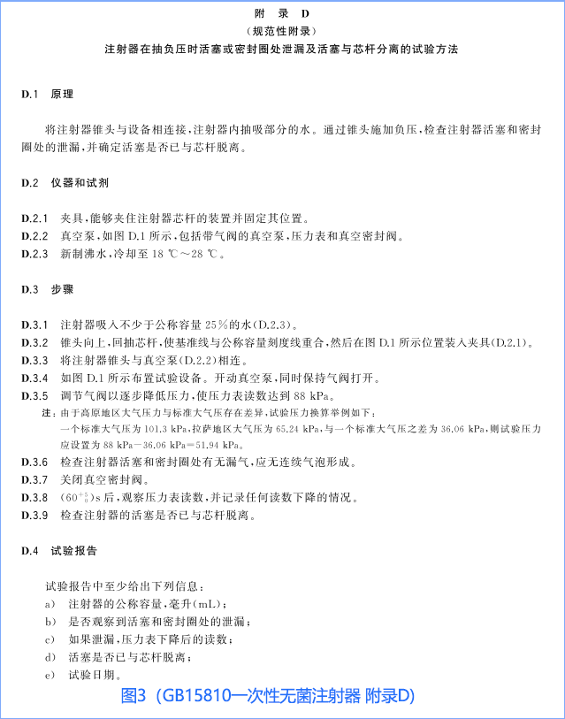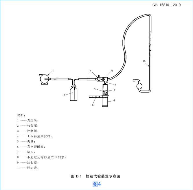 按照下圖3開展試驗(GB15810標(biāo)準(zhǔn)中的附錄D),活塞或密封圈處應(yīng)無氣體泄漏現(xiàn)象,且壓力表的讀數(shù)不應(yīng)持續(xù)下降。抽吸示意圖參考圖4(GB15810標(biāo)準(zhǔn)中的圖D.1)。