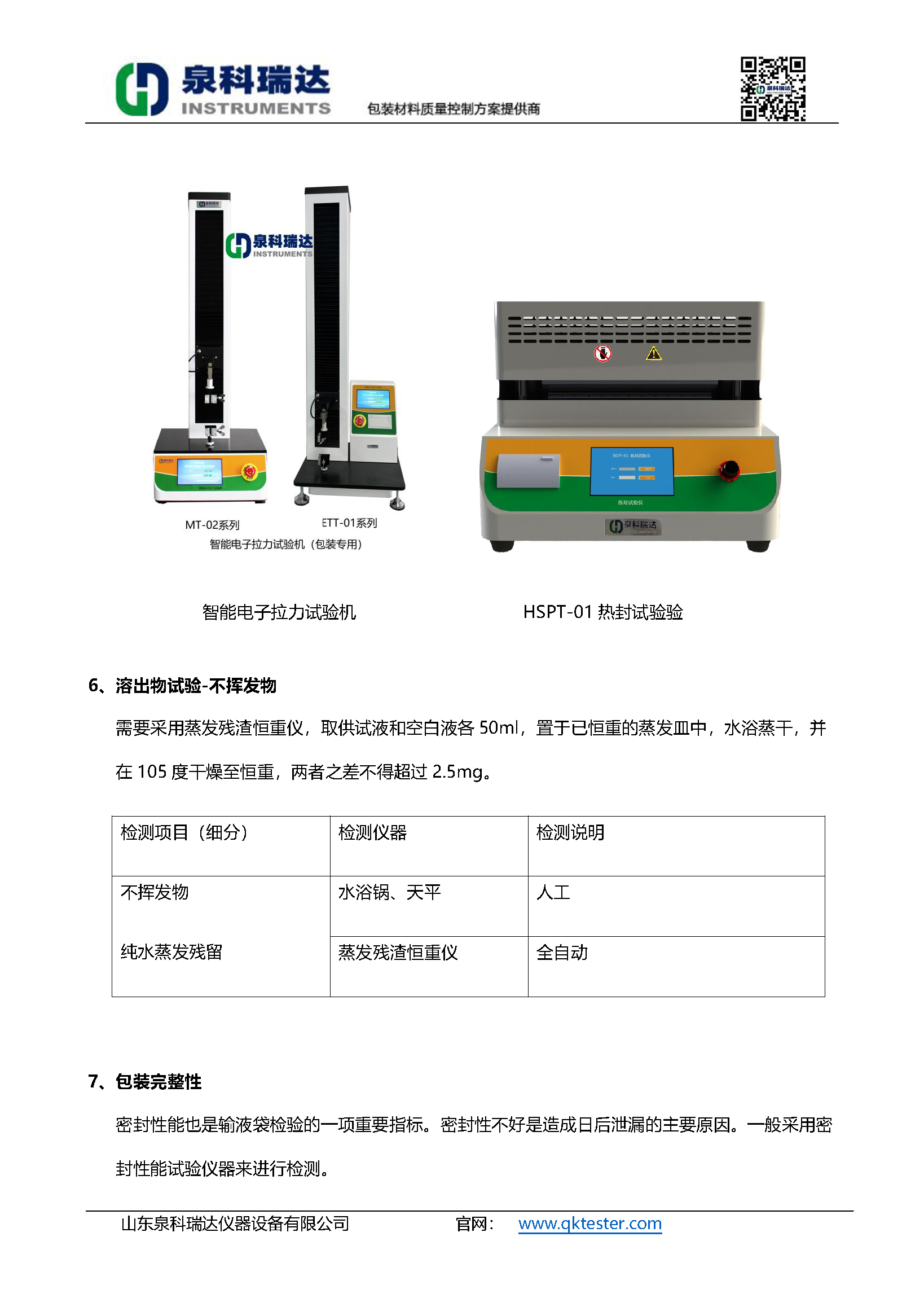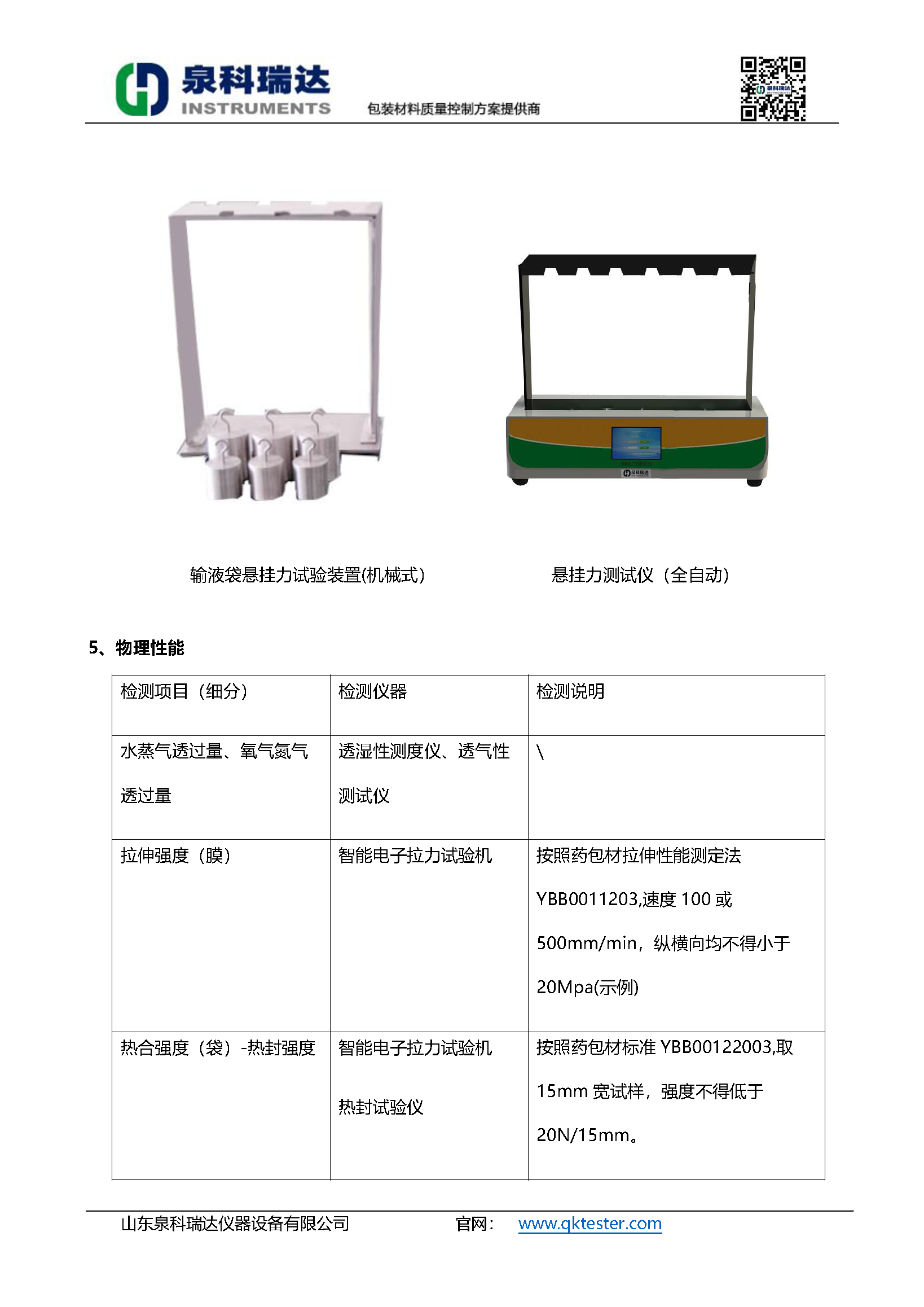 泉科瑞達(dá)(qktester.com)作為主流專業(yè)藥包材檢測(cè)儀器方案商,有著專業(yè)的藥包材檢測(cè)經(jīng)驗(yàn);現(xiàn)結(jié)合YBB藥包材標(biāo)準(zhǔn),整理“輸液用膜、袋”的質(zhì)量控制指標(biāo)與檢測(cè)儀器配置方案。如需更為全面了解,請(qǐng)參考相關(guān)標(biāo)準(zhǔn)或與我司進(jìn)行深入溝通。