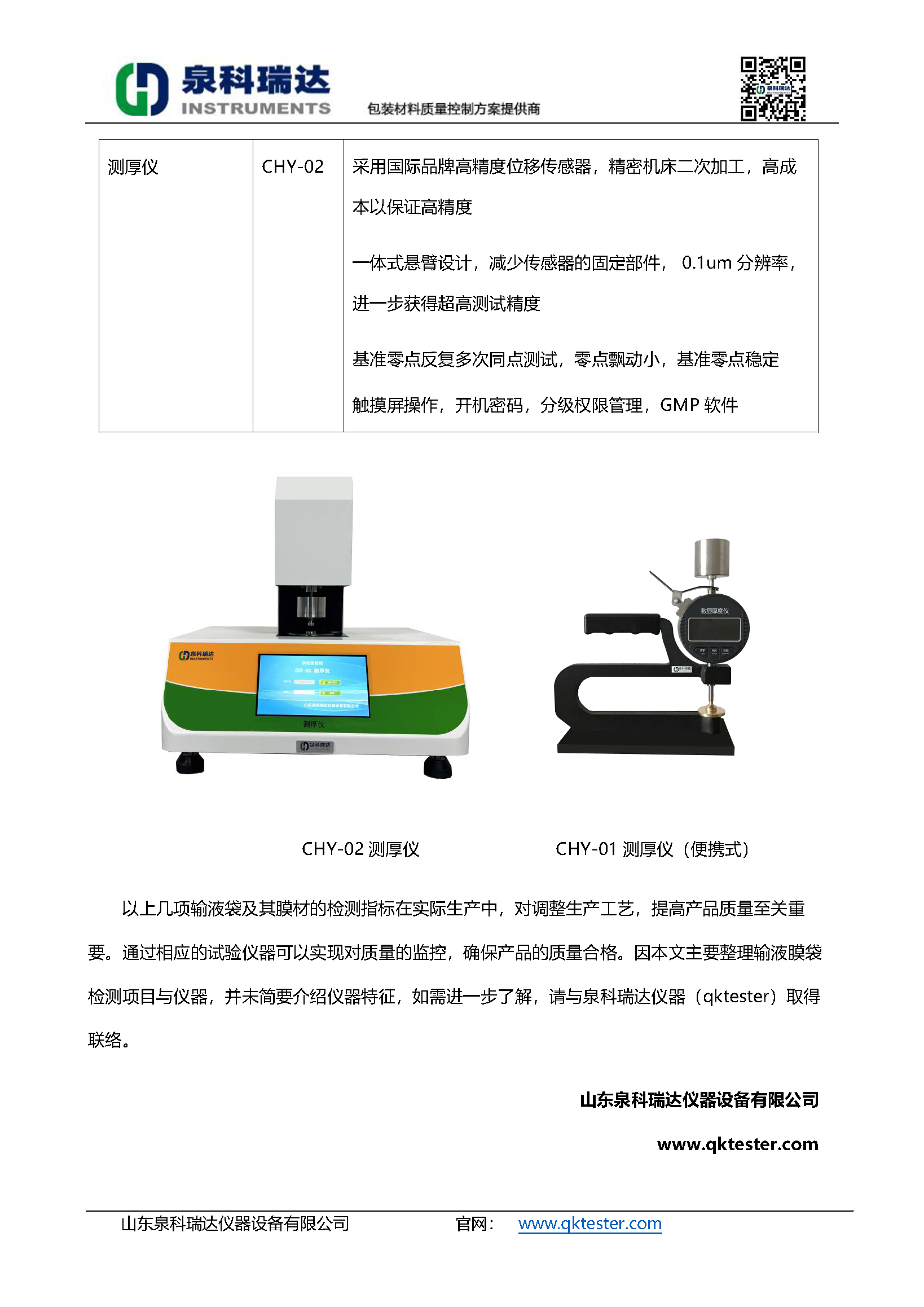以上幾項(xiàng)輸液袋及其膜材的檢測(cè)指標(biāo)在實(shí)際生產(chǎn)中,對(duì)調(diào)整生產(chǎn)工藝,提高產(chǎn)品質(zhì)量至關(guān)重要。通過相應(yīng)的試驗(yàn)儀器可以實(shí)現(xiàn)對(duì)質(zhì)量的監(jiān)控,確保產(chǎn)品的質(zhì)量合格。因本文主要整理輸液膜袋檢測(cè)項(xiàng)目與輸液膜袋檢測(cè)儀器,并未簡要介紹儀器特征,如需進(jìn)一步了解,請(qǐng)與泉科瑞達(dá)儀器(qktester)取得聯(lián)絡(luò)。