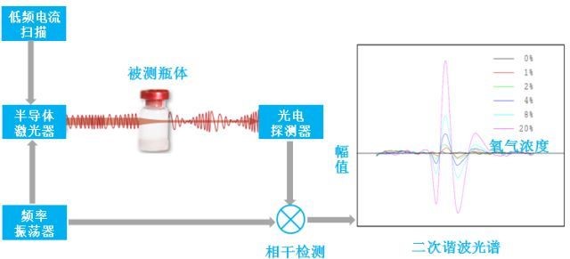 激光檢測法是運(yùn)用TDLAS(可調(diào)諧半導(dǎo)體激光吸收光譜)激光檢測技術(shù)檢測無菌制劑容器密封完整性的一種無損、定量方法,該方法獲得了FDA、美國藥典及歐盟藥典推薦,檢測精度優(yōu)于1μm。氧氣分子對(duì)760nm激光具有吸收效應(yīng),根據(jù)Beer-Lamber(比爾-朗伯)光學(xué)吸收定律,被測氣體對(duì)激光的吸收量與氣體濃度成正比,通過光學(xué)相干技術(shù)獲得激光的二次諧波光譜圖,二次諧波光譜圖的幅值變化與容器中氧氣濃度相對(duì)應(yīng),從而判斷容器的密封完整性。