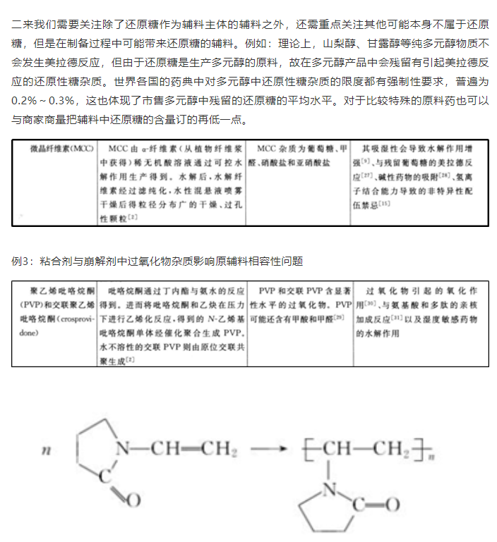 原輔料相容性通過設(shè)計(jì)成原料藥與輔料二者的二元混和系統(tǒng),考察原料-輔料之間可能存在理化性質(zhì)的方面的相互作用。當(dāng)然,由于輔料自身的一些特點(diǎn),其通常不是化學(xué)物的形式存在,而是多種物質(zhì)共同組成的一個(gè)混合物。那么,原料-輔料之間的作用,就不僅僅局限于原料-輔料之間,可以擴(kuò)展至原料-輔料中的雜質(zhì),輔料-輔料之間,輔料雜質(zhì)-輔料雜質(zhì)之間,其中輔料中雜質(zhì)容易與原料藥出現(xiàn)相容性問題。